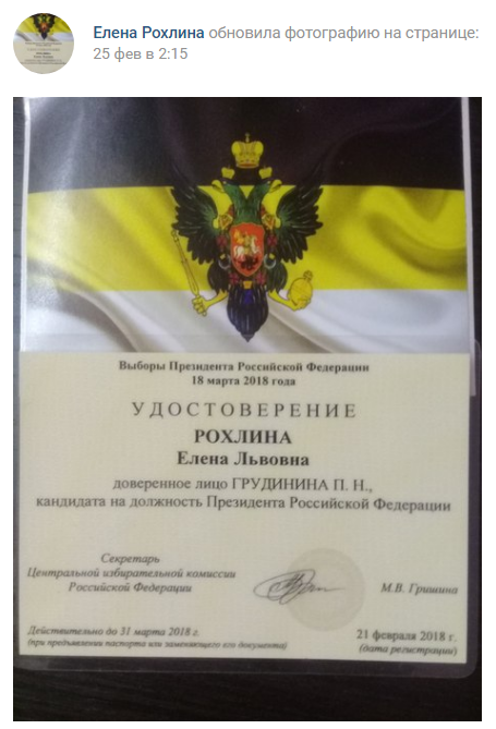В принципе, несложно было заметить, что Рохлина в последнее время оказалась в самом ближайшем окружении Грудинина. Например, 5 февраля этого года она выступала на его пресс-конференции в Ростове-на-Дону и назвала себя представителем выдвинувших Грудинина в президенты националистов.