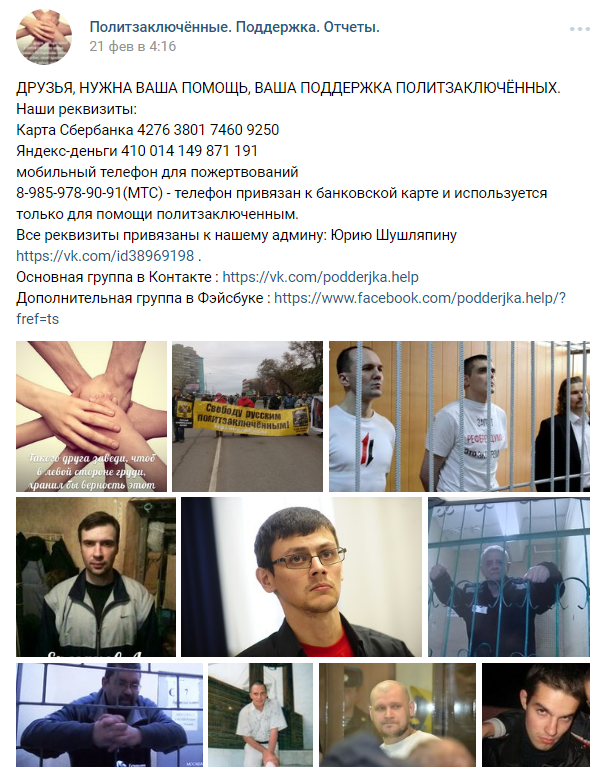 — Для помощи политзаключённым Алексею Кунгурову, Николаю Королёву, Петру Молодидову и Юрию Староверову перечислено по 3000 рублей. Спасибо всем за поддержку! — сообщается в посте, опубликованном в группе 23 февраля этого года.