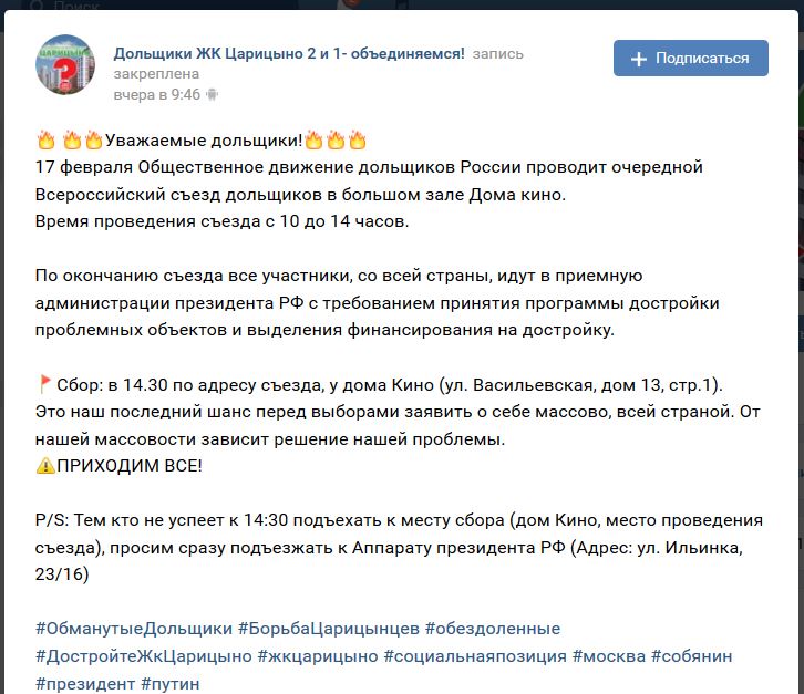 Сегодня, 17 февраля 2018 года, Общественное движение дольщиков России проводит съезд в Доме кино в Москве. Планируется, что приедет около 1200 человек из 27 регионов России.