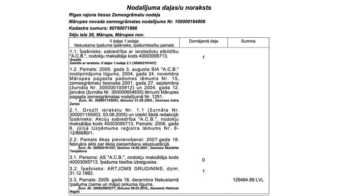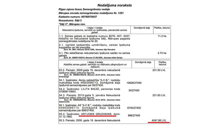 Вместе с домом Грудинин-младший приобрёл землю под ним. Согласно выписке из Кадастровой книги Латвии, продавцом выступало местное кооперативное общество АСВ. Именно ACB управляет всем коттеджным посёлком Сели и было его застройщиком.