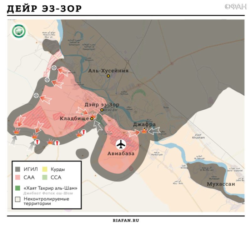 Провинция Дейр эз-Зор Сирийские войска, располагающиеся к югу от города Дейр эз-Зор, вновь активизировали контрнаступательные действия. Подразделения САА атаковали укрепленные районы террористов ИГ вблизи базы 137-го полка САА, недалеко от правительственного аэродрома, все еще заключенного в кольцо боевиков, и на окраине квартала Аль-Синаа.